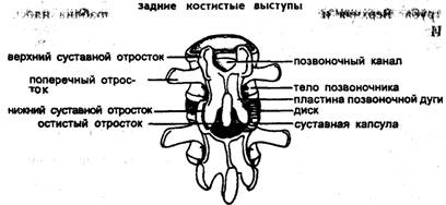 Рис. 3. Сзади позвоночник представляется костным щитом, прикрывающим содержимое позвоночного канала. Дополнительную прочность суставам придают прикрывающие их жесткие капсулы. Боковые отростки предназначены для прикрепления мышц.