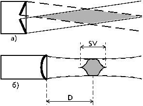 Рис. 1.18 Непрерывно-волновой (а) и импульсный (б) УЗ допплеровские датчики